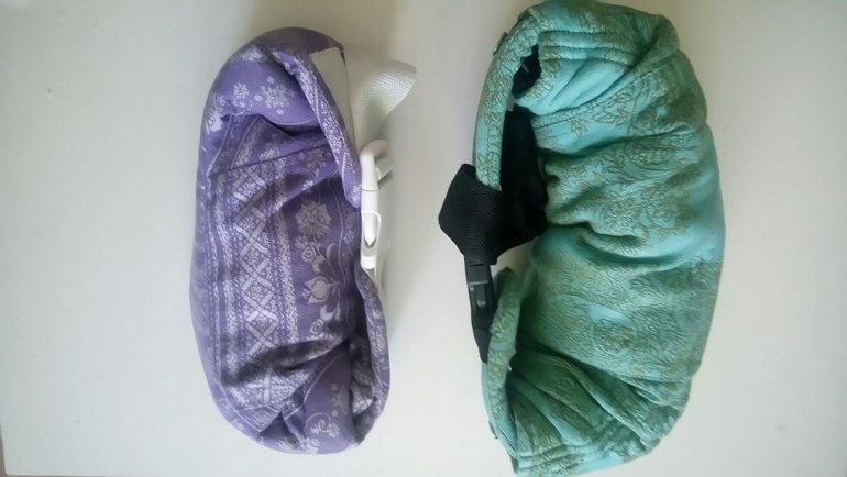 Ну и в заключение, несколько слов о компактности. Для шарфового эргорюкзака это, на мой взгляд, важная характеристика. Провела небольшой эксперимент: максимально свернула «Диву» и положила рядом «Карауш» , Все-таки Diva помощнее и больше места займет в чемодане, если вы собираетесь в отпуск. Но зато у нее есть классная функция - сворачивание на поясе. Очень удобно с подросшим ребенком, которому надо потопать ножками: малыша спустили, а рюкзак снимать с себя не надо. «Карауш» этим похвастаться не может.