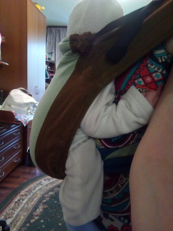 В процессе прогулки деть ещё немножко "просел", ножки поднялись повыше. Вроде спал, не беспокоился))) покормить в слинге не получилось, высоковато примотала, попробую ниже))