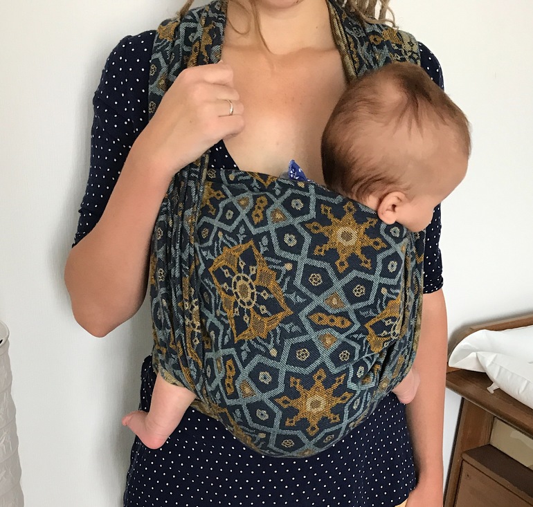 Вот, в один слой. Кажется, верхняя треть снова не дотянута, но мне почему-то не хватает рук притянуть сильнее. Под коленями складки, но в следующий раз при намотке я изначально оставила больше ткани на нижнюю треть, пока в кармане ещё не было ребёнка и складки лучше распределились, потому что была лишняя ткань для заправления. Только не знаю, можно/нужно ли так делать 🤷♀️