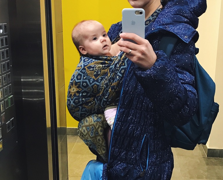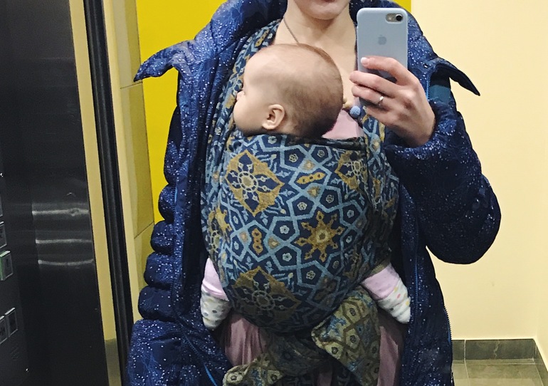 Я тоже приподнимаю, потому что я вообще вытягиваю кармашек изнутри, между нашими животами. Прямо теряюсь))) Есть у меня мысль, что верх может быть недотянут, поэтому вся намотка проседает. Может быть, вам в фейсбуке показаться консультантам? 😊
