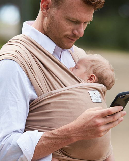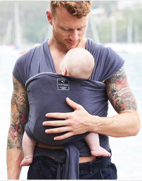 На фото Hugabub, трикотажный слинг-шарф цвета антрацит и латте.