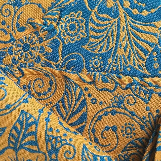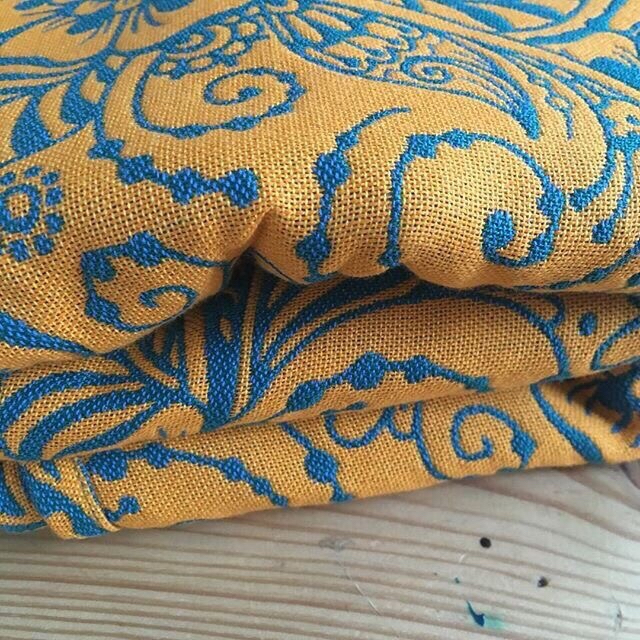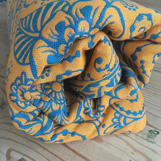 Желто-оранжевый с ярко-голубым, очень классное, сочное сочетание цветов, которых так не хватает монохромной зимой. Есть в длине 4,6 метра.