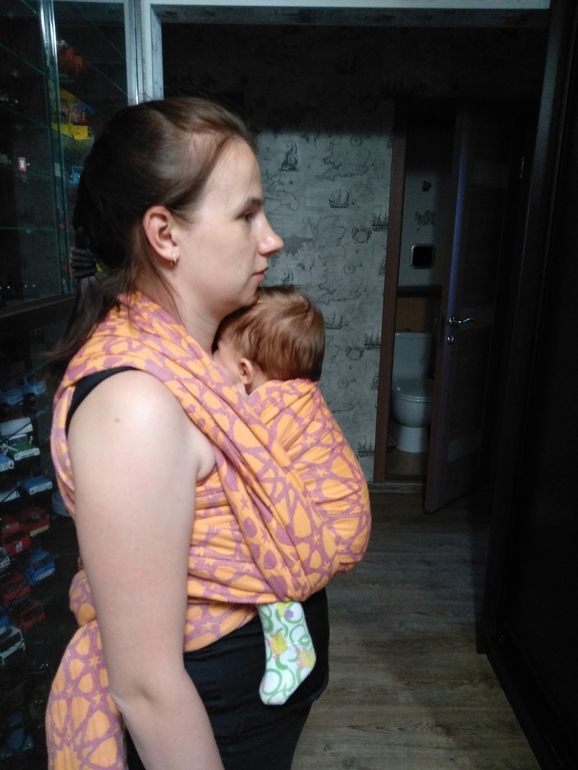 А тяжело дышать предположу потому, что ребенок высоко замотан - он весь в районе вашей груди и круг ткани вокруг себя у вас идет прямо под грудью: вы наверное всю диафрагму себе сдавили( Обычно в намотке хвосты вокруг себя выводят на талии