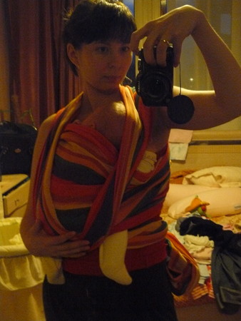 на первый взгляд- приматывать поплотнее, и расправлять лямки на всю ширину по плечам. Мне лично было удобней в КПК, и до трех месяцев я носила СОню с ногами внутри, лягушкой.