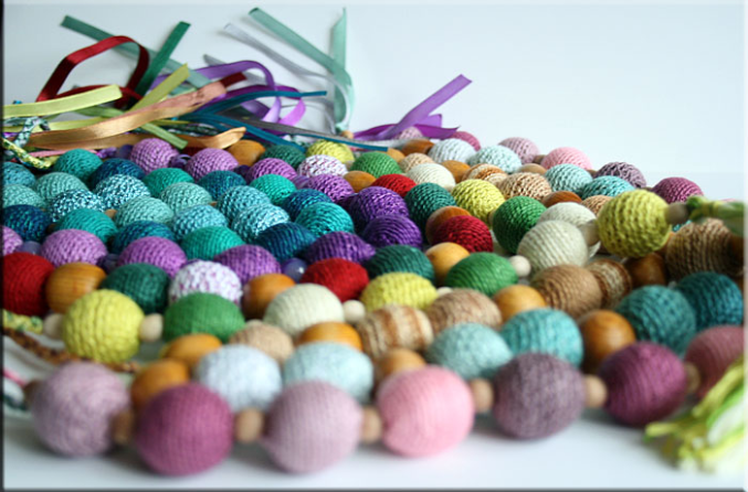 13 обвязанных можжевеловых бусин, маленькие деревянные бусинки для разграничения, атласные ленты.