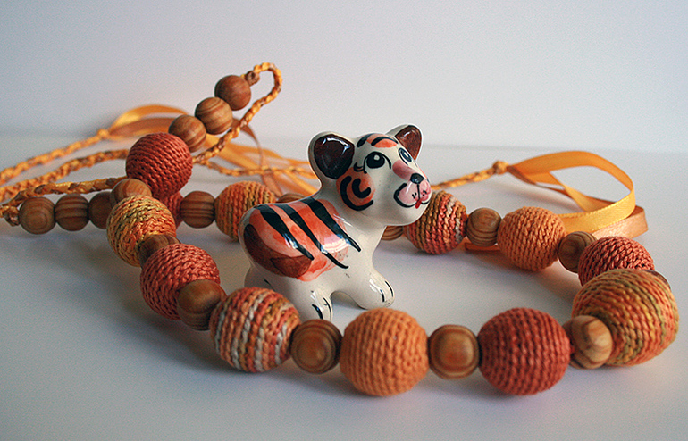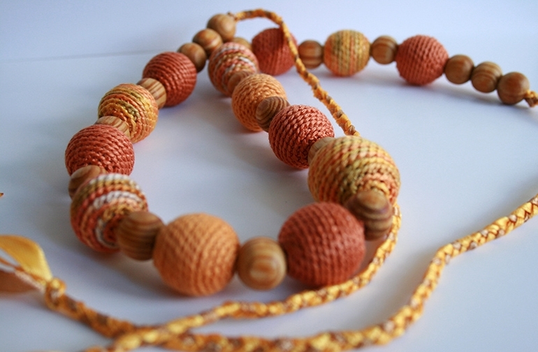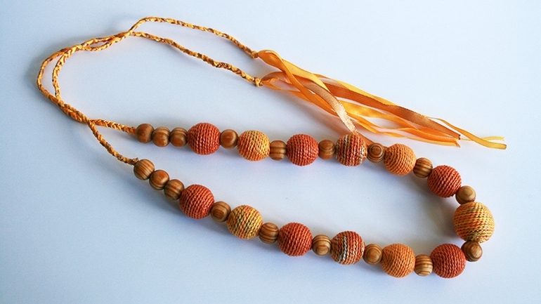 Материал: 13 обвязанных хлопком можжевеловых бусин, 18 можжевеловых бусин без лака, атласные ленты.