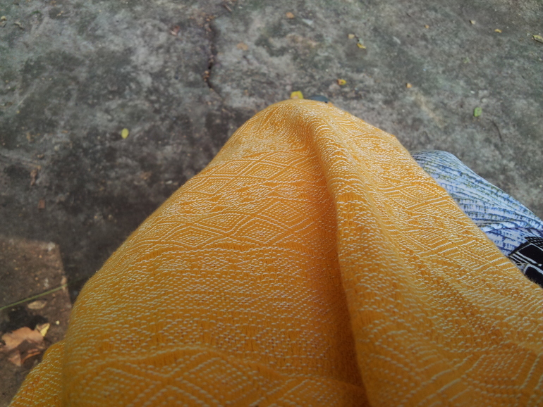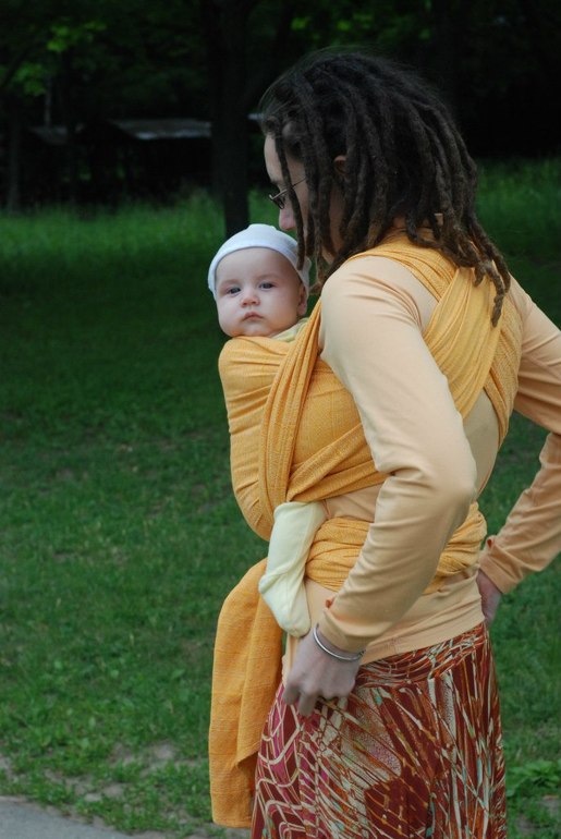 Сперва меня смущал цвет, но после 1-2 намоток я его полюбила. В зависимости от освещения он разный, но прекрасный ). Теперь смущает длина: вяжем только ребозо, а для этого дела у нас еще шарфик есть, 3, которую и на усеченный КНК, и на кенгуру хватает. Вот и лежит ночка, а могла бы попу ребенкину носить.