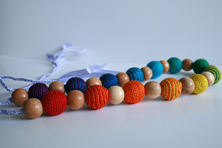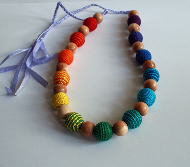 Материал: 13 обвязанных хлопком можжевеловых бусин, 14 бусин для разграничения без лака, атласные ленты.