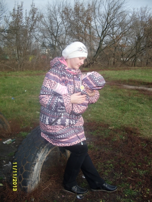 Замечательная длина куртки спрячет от холода расположившегося под курткой малыша в возрасте от 0 до 3 лет. Прорези на уровне груди обеспечат удобный доступ под куртку без расстегивания основных молний (можно как просунуть руки вовнутрь, поправить слинг, погладить малыша, так и дать ребенку высунуть свои ручки наружу и покормить грудью).