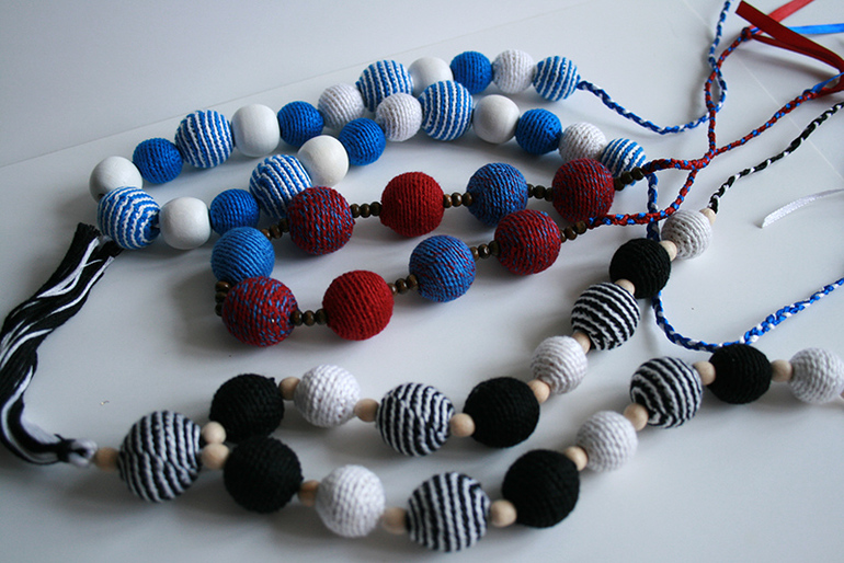 материалы: 17 обвязанных хлопком можжевеловых бусин, 19 маленьких деревянных бусинок для разграничения, кисточка из хлопковых ниток, атласные ленты. Можно смело грызть, теребить и просто с удовольствием носить.