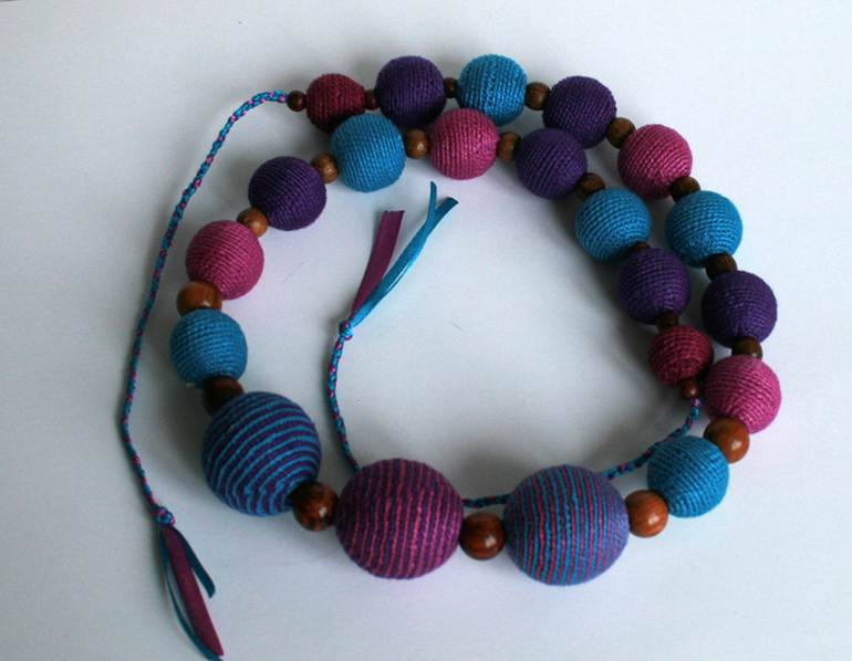 Материал: 21 обвязанных хлопком можжевеловых бусин, 23 бусин для разграничения с лаком, атласные ленты.