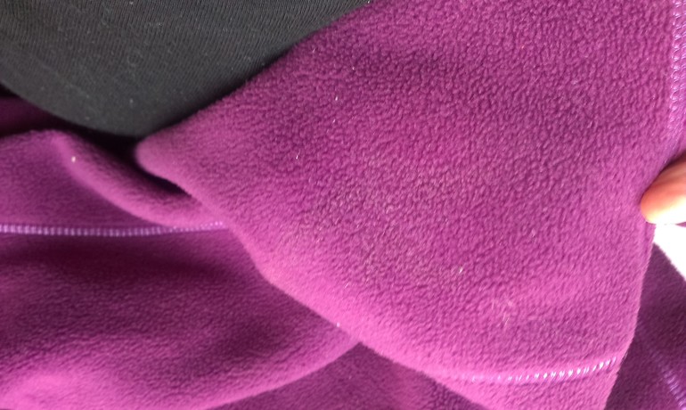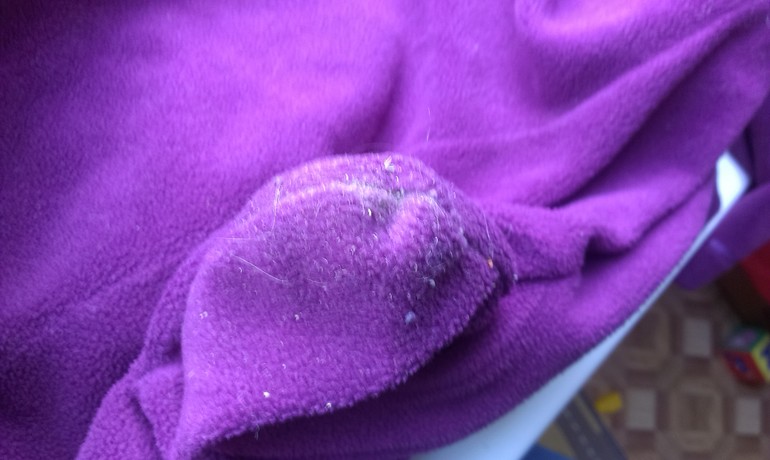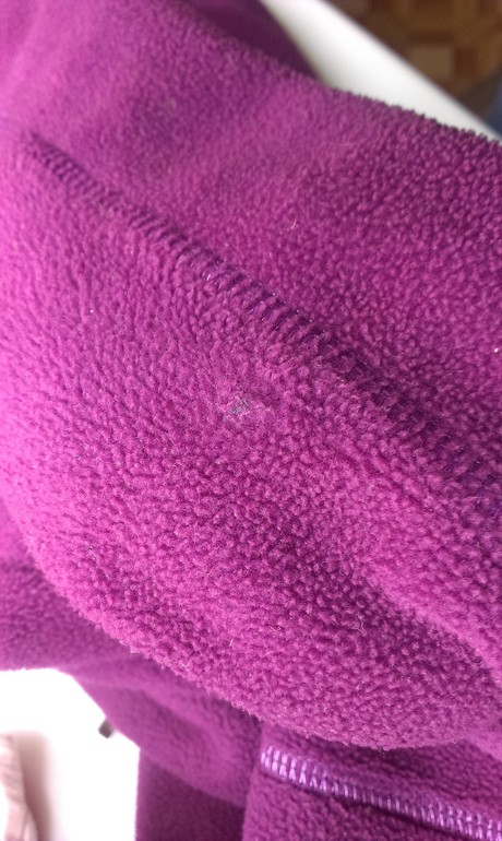 Посылка пришла быстро. Следов вскрытия на пакете не было. Когда я вскрыла пакет, я была неприятно удивлена. Флиска была вся в крошках от булки, шерсти и пуху. В карманах были крошки, песок и волосы, от куртки неприятно пахло грязной вещью. Кроме того было белесое пятно, и след от подпала (толи сигареты, толи искры от костра) на рукаве. Позже обнаружила такой же на груди.