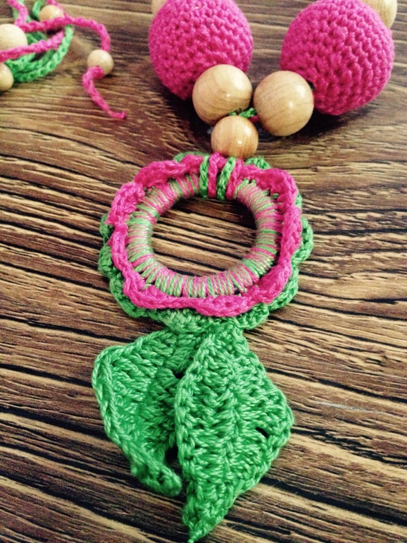 Слингокулон "Ягодка-малинка", выполнен из 100% хлопковой нити и можжевеловых бусин и колечка. 450руб.