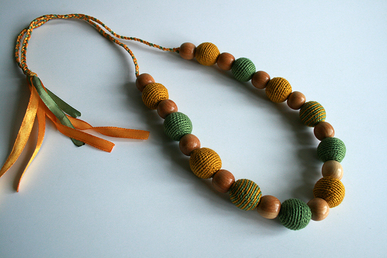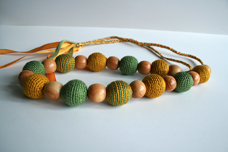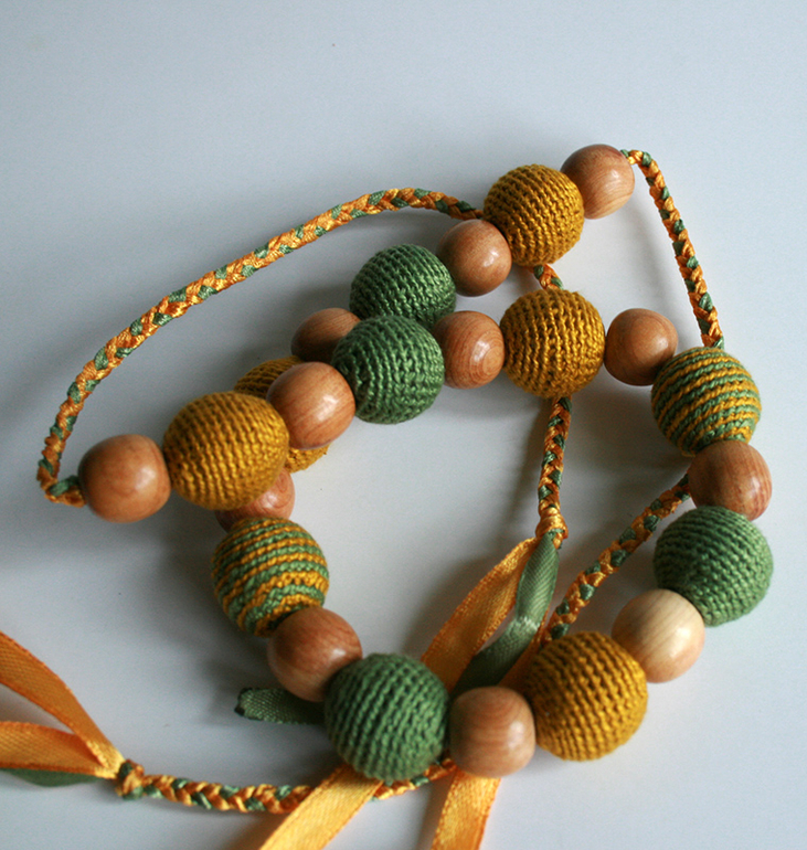 Материал: 11 обвязанных хлопком можжевеловых бусин, 12 можжевеловых бусин для разграничения без лака, атласные ленты.