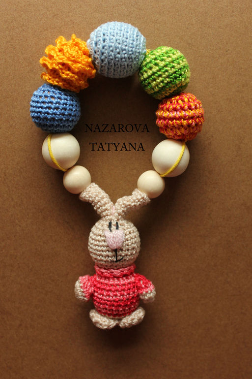 Грызунок-прорезыватель и просто замечательная игрушка для маленьких ручек "Зайка". Состав: деревянные бусины, бусины из белого граба, вощёный шнур, хлопчатобумажные нитки. Повтор возможен и в других цветах.
