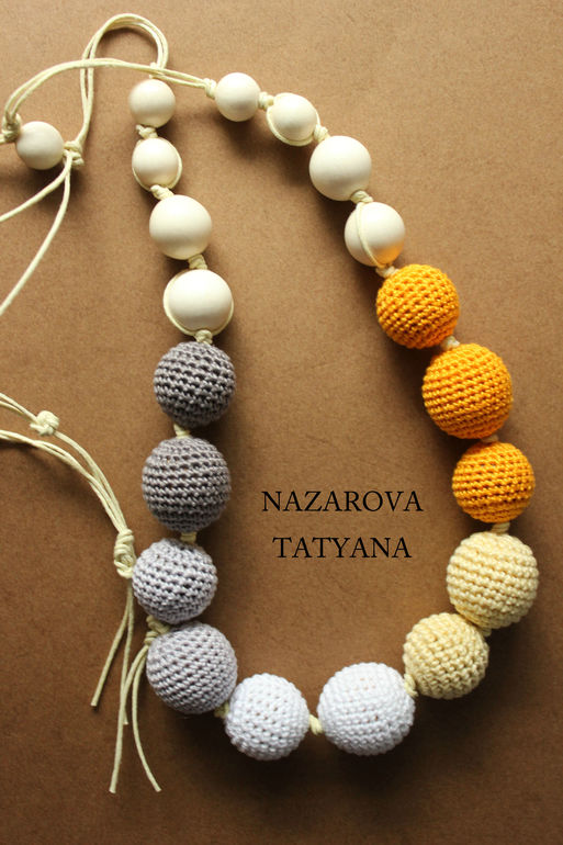 Слингобусы "Первые лучи". Состав: хлопчатобумажные нитки, вощёный шнур, можжевеловые бусины, бусины из граба (дерево граб относится к семейству Березовых и является лиственным). Цена 650 руб.