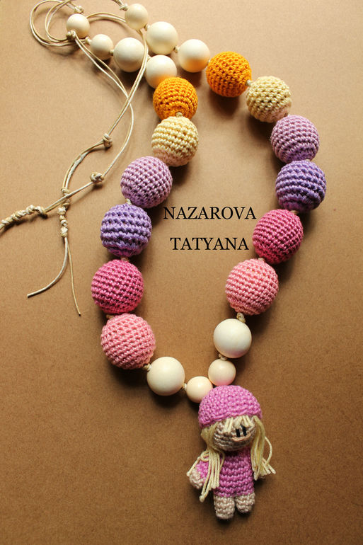 Слингобусы "Малышка". Состав: хлопчатобумажные нитки, вощёный шнур, можжевеловые бусины, бусины из граба (дерево граб относится к семейству Березовых и является лиственным).