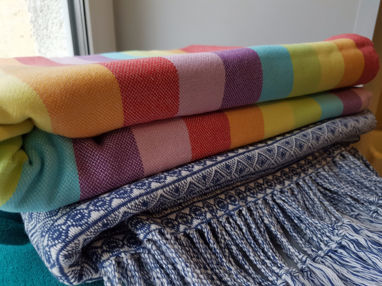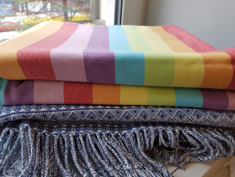 Размер - была 6-ка, после изготовления бахромы стала длинная 5-ка 4,30м. У этого шарфа были пропуски уточной нити, ушли при плетении бахромы.