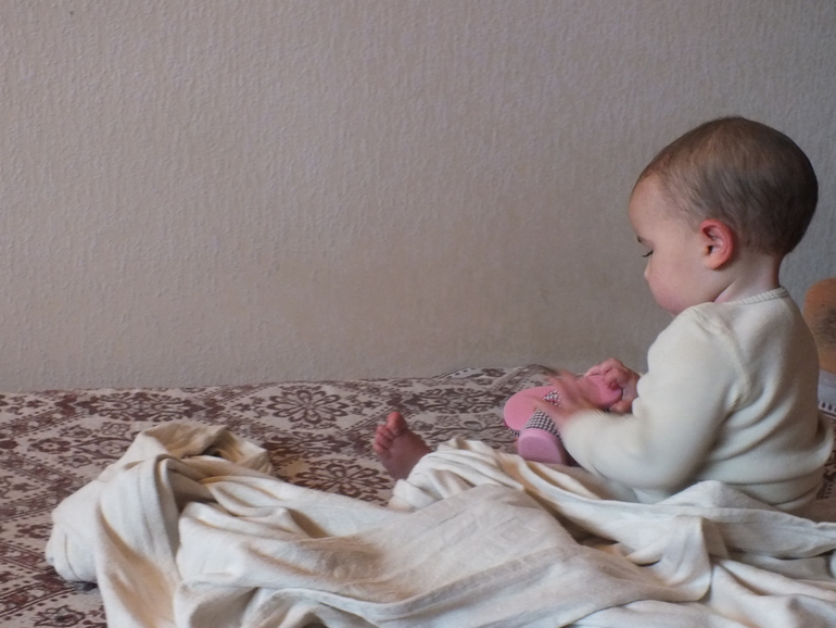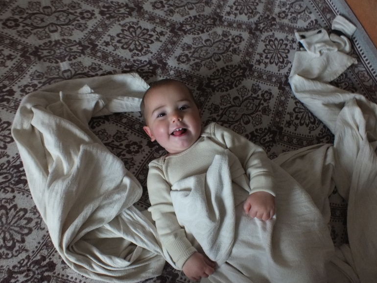 Шарфик приятный на ощупь, держучий, 10 кг моей дочурки я почти не замечала, структура волокна хорошо ощущается, при близком рассмотрении маленькие фактурные катышки