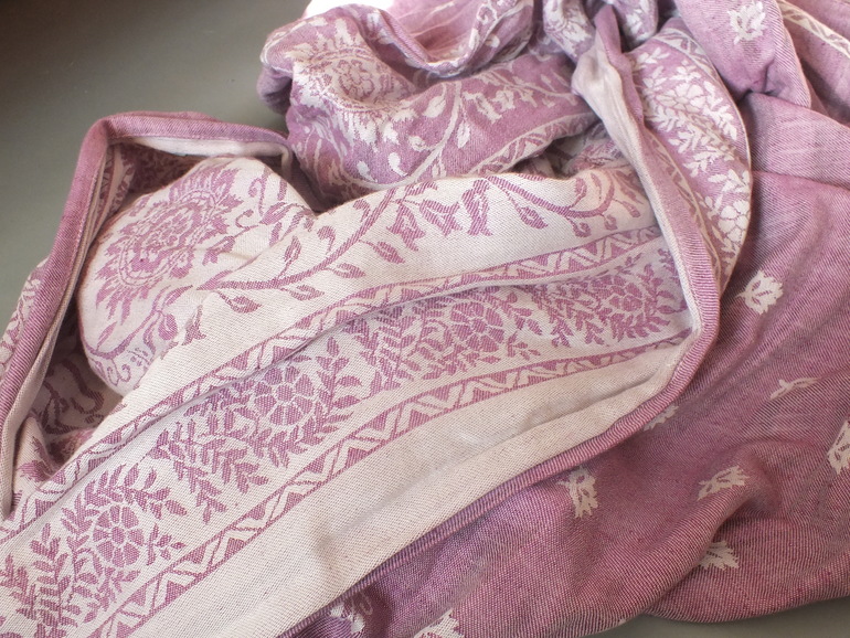 Нежно-розовый, скорее светло фиолетовый шарфик, с прекрасным принтом, можно носить светлой стороной, но мне больше нравилась розовая.