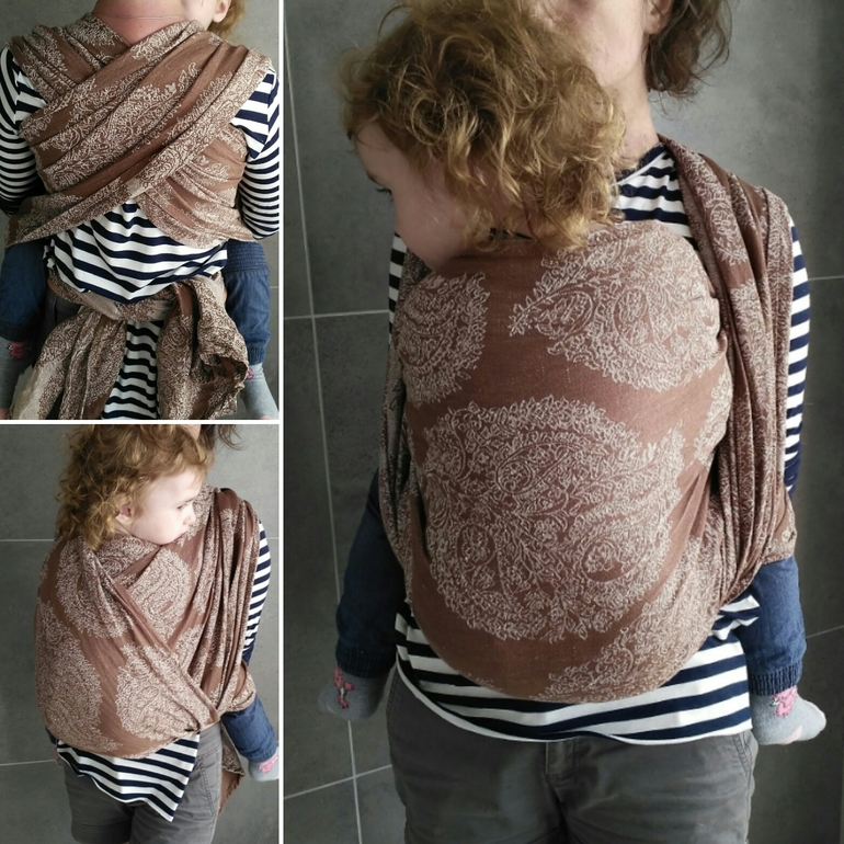 Пятерка отлично подходит мамам 40-44 размеров, которые не любят выводить хвосты шарфа вперёд. Вообще этот шарф меня приятно удивил, он быстро становится мягким и податливым, отлично ложится в намотку и несёт. Месяцев с трёх и до окончания слингоношения - вполне вариант, и носить его можно в хвост и гриву, ничего не будет, только лучше станет) А как он смотрится в намотке!