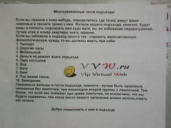 ля-Муррр в Юмор 13 лет Добро пожаловать к нам))) На злобу дня Посмотрите еще 20 записей на эту тему Отменить Ответить Ольга беру себе в закладки!!! такое надо у родителей повесить. 02.07.2012 Ответить ля-Муррр здоровым но без лампочки, чем инвалид с лампочкой 03.07.2012 Ответить Ожинка 02.07.2012 Ответить Гроза и злой Wi-Fi Посмеемся от души:))) Чаты Беременных Выберите чат: Январята-2026 Февралята-2026 Мартята-2026 Апрелята-2026 Майчата-2026 Июнята-2026 Июлята-2026 Августята-2026