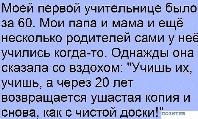 эт точно ;) не поверишь, в моей школе учились еще и моя мама, и мой дядя (разница у них 6 лет). так вот всех нас троих вела по физкультуре одна и та же учительница!!!!!! она до сих пор работает!!!!!! и на лыжах ходит!!!!!