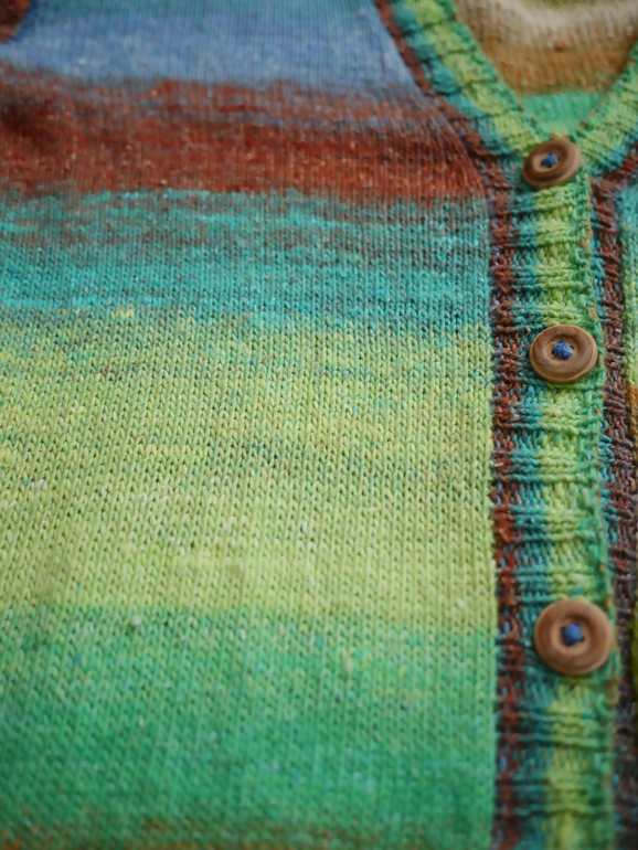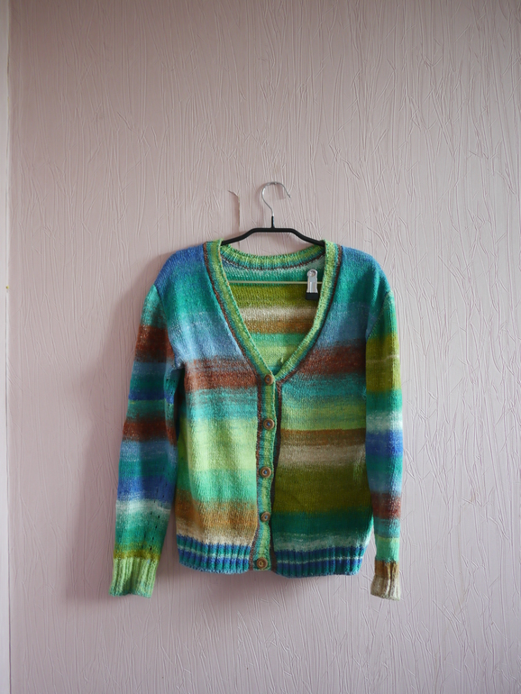 Кофта себе из носочной Noro. Пусть не введет вас в заблуждение "носочной", по составу это 50% хлопок, 17% шерсть, 17% полиамид, 16% натуральный шёлк. То есть носочки получатся натурально дворцовый вариант. Выбрала я эту пряжу из-за хлопка в составе - хотелось кофту на прохладное лето. Да и остальное в составе просто диво-дивное. Надо ли отдельно говорить о расцветке ниток? - думаю, и так все понятно. В общем, Noro - это любовь на всю жизнь, даже если и не с первого взгляда. Еще в этой кофте я первый раз попробовала втачной рукав вязать т н "частичный вязанием". У меня первый раз нормально получился втачной рукав, теперь я только так буду их делать. Правда в расчетах я таки немного ошиблась, и вместо 42-44 получила 40-42. Для меня не критично, поскольку я все-таки 42, на футболку или блузку носится отлично. Сейчас уже неоднократно кофта была выгуляна, съездила на шашлыки за город, пережила несколько стирок. Ничуть не изменилась, не деформировалась, не вылиняла. Из-а хлопка локоточки немного выягиваются, но после стирки все возвращается в исходную форму