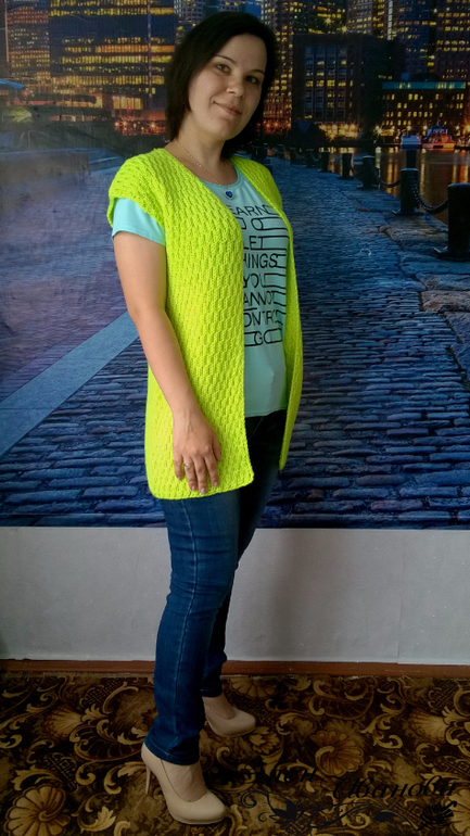 малиновый кардиган связан из акрил (название не помню), спицы 4,5, шишечки на платочном узоре с кармашками, лимонный связан из вита бриллиант в 2 сложения, спицы 4,5, узор соты из резинки