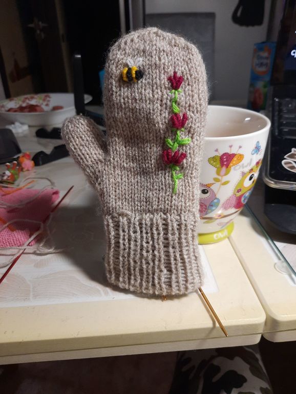 В процессе варежки двойные. Вяжу обычно под фильмы, ютюб, конфеты и чай