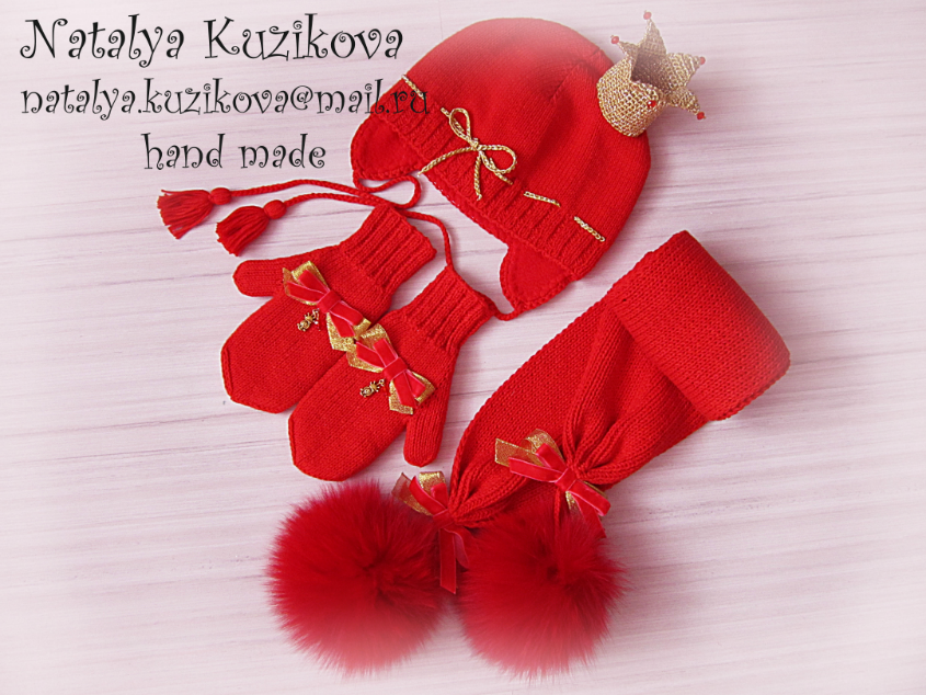 Шапочки, шарфы, варежки для детейКомплектик связан на заказ. Варежки и шапочка на флисовой подкладке. Украшен хрустальными камушками и подвесками цвета залота.