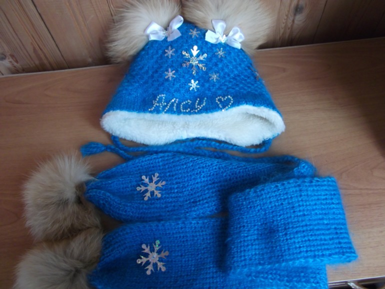 Девоньки, вот какой комплект связала я на зиму дочке, зимы у нас лютые, поэтому шапка нужна была максимально теплая. Весь комплект сделала сама - и меховые помпоны, имя дочки выложила стразами, декорировала перламутровыми снежинками, на свету переливаются очень красиво. Пряжа с мохером, пушистая, подкладку сделала из старой шапки на овчинке.