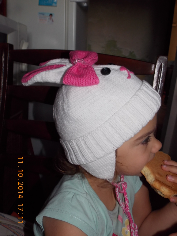 Сомневалась нужен бант или нет, изначально планировались просто ушки, но когда связала, мне показалось, что чего-то не хватает, так на шапочке появился еще и бантик)))