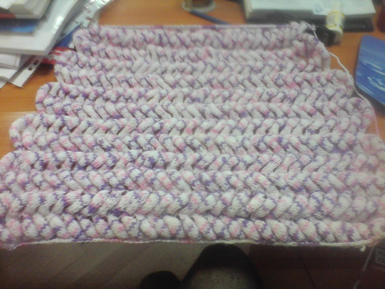 ДА, но это потому что у меня шарф широкий будет, на 90 петелек. Считайте каждые три петельки=полосочка. Всего 30 полосочек в ряду. Итого на один ряд уходит 1,5 — 2 часа. А вы что хотите связать. Еще не представляю как платьице летом дочке этой вязочкой вязать, но очень хочу.