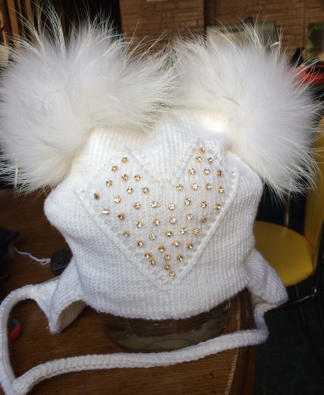 Шапочки, шарфы, варежки для детейДевоньки, увидела шапку чоби за 4600 изошлась слюной, но денег жалко!!! Пришлось вязать копию! Ну как вам, 100% шерсть , енот и камушки сваровски!!!забыла уточнить, шапочка двойная без швов, начинала вязать со шнурочков