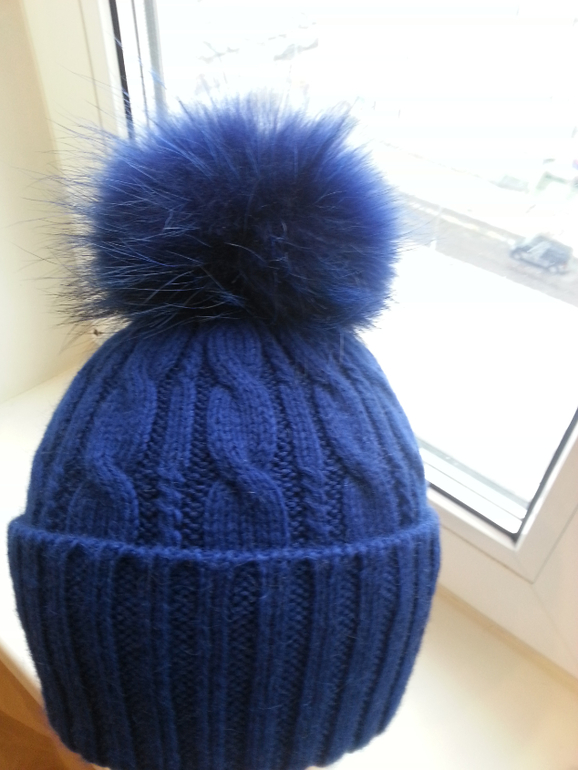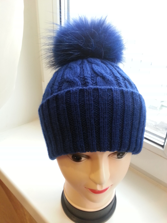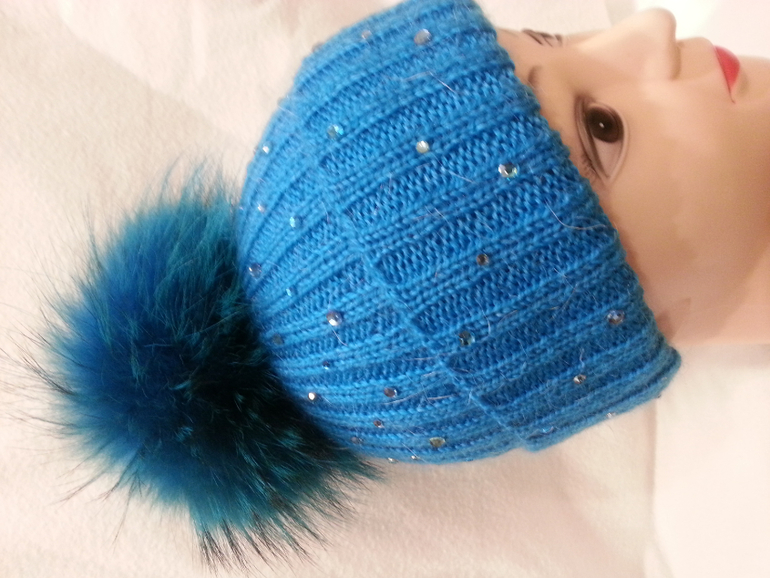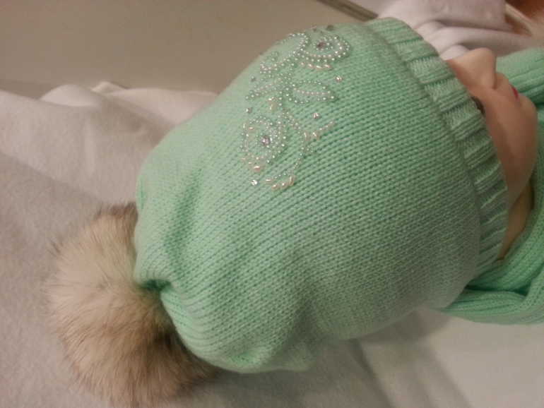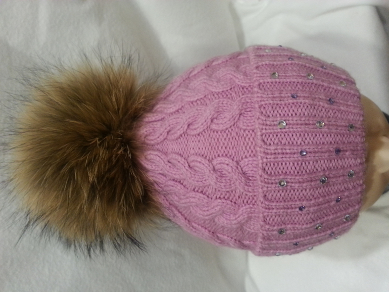 12. Шапочка одинарная с отворотом, вывязанными совами, стразами и помпоном из белого финского енота.
