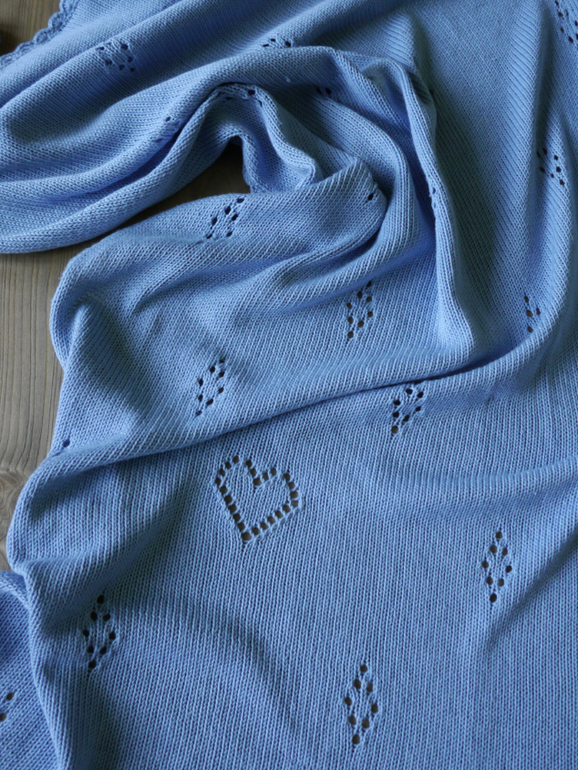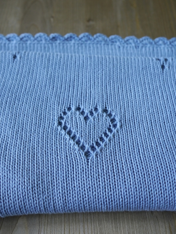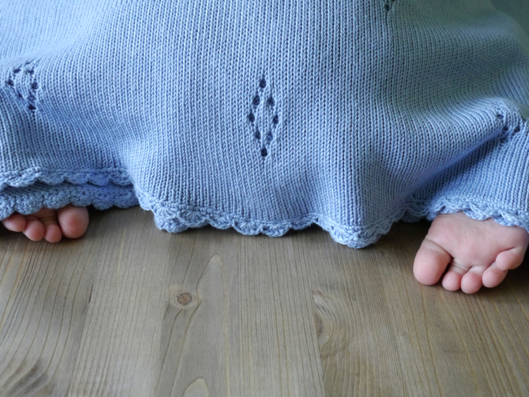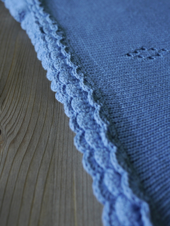 Пряжа просто чудо, самая летняя, какую можно придумать. Это смесь льна, хлопка и вискозы - мягкая, шелковистая, прохладная, вискоза дает легкий благородный блеск. Рисунок простой, чтобы не перегружать работу, но где-то в рисунке спрятались два сердечка - милая деталь, которая напоминает, что плед для любимого малышика. И цвет выбрала как раз для мальчишки - голубые джинсы. Сейчас в работе копия цвета зеленого яблочка, по готовности покажу.