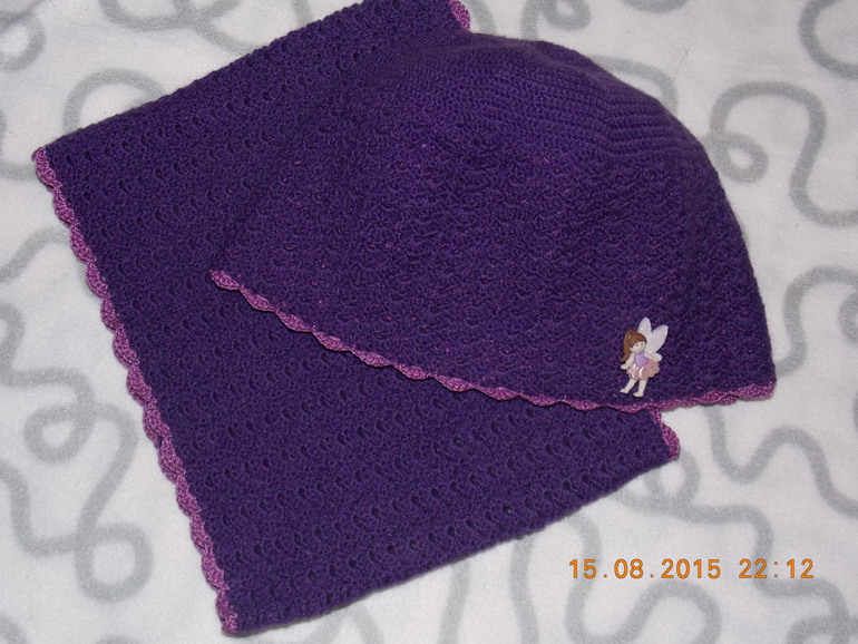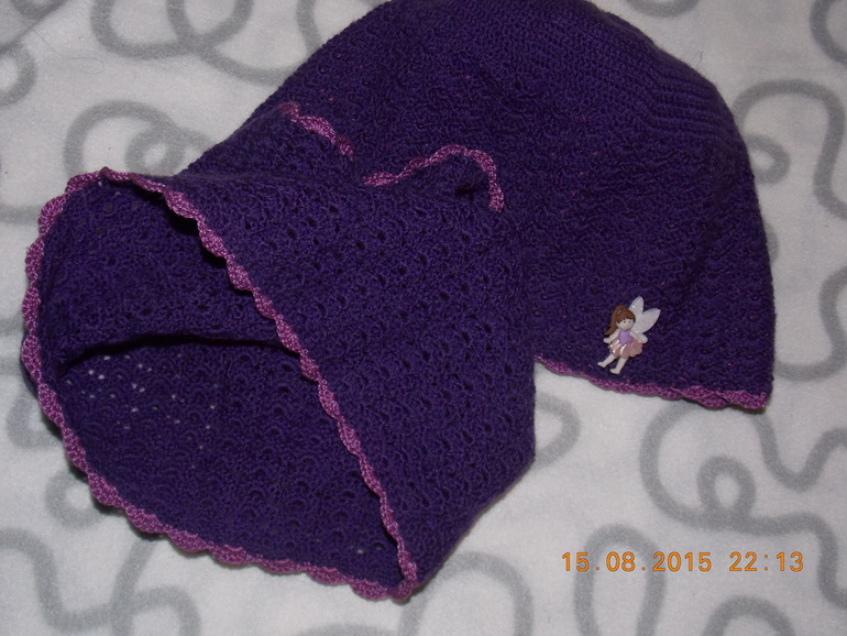 Вторая - комплект со снудом для новых знакомых. Девочка чуть старше моей дочурки, от нее нам досталось не мало прекрасных вещей. Отблагодарить за огромный вклад в пополнение нашего гардероба решила своим рукоделием. Резиночки-канзаши из запасов уже подарены, осталось вручить этот комплект. Снуд однослойный в один оборот (размер 50*25 см), шапочка двухслойная (верх шерсть, внутри хлопок, крючек №1,9) на объем головы 52-54 см.