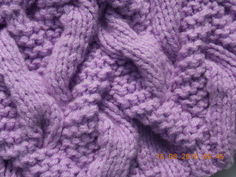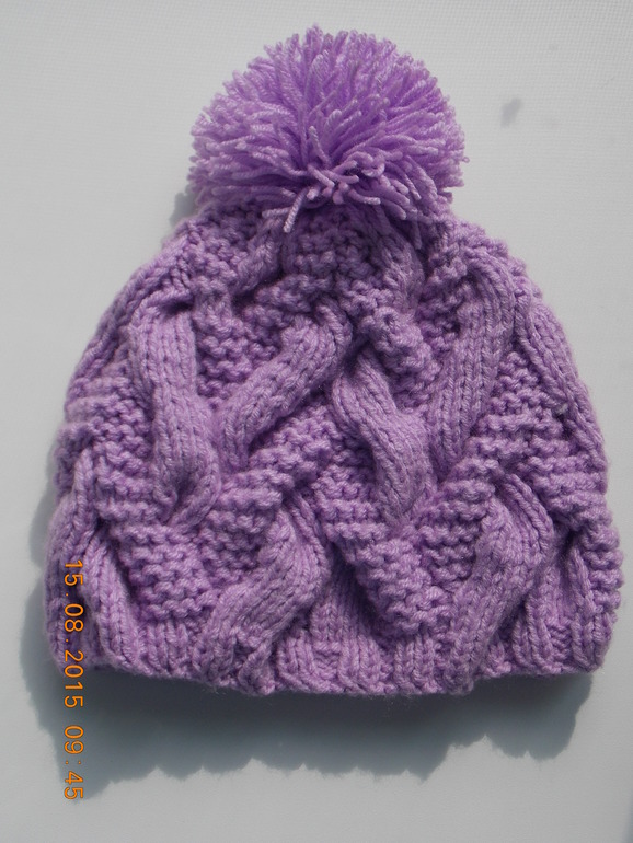 Первая - для подружки моей доченьки. Они, в силу обстоятельств, сейчас от нас далеко, но к дню рождения сегодня отправили маленький подарочек. Шапочка связанна из пряжи, которая мне досталась в подарок, была без этикетки. Так что характеристик не знаю, но на ощупь мягусенькая, теплюсенькая - склоняюсь к тому, что полушерсть))) Вязала в две нити на спицах №4 и №4,5.