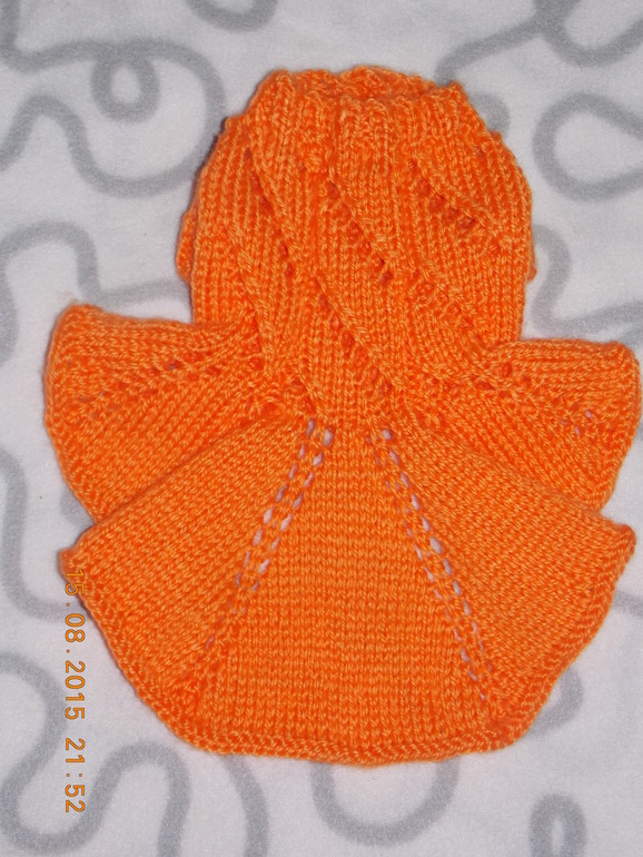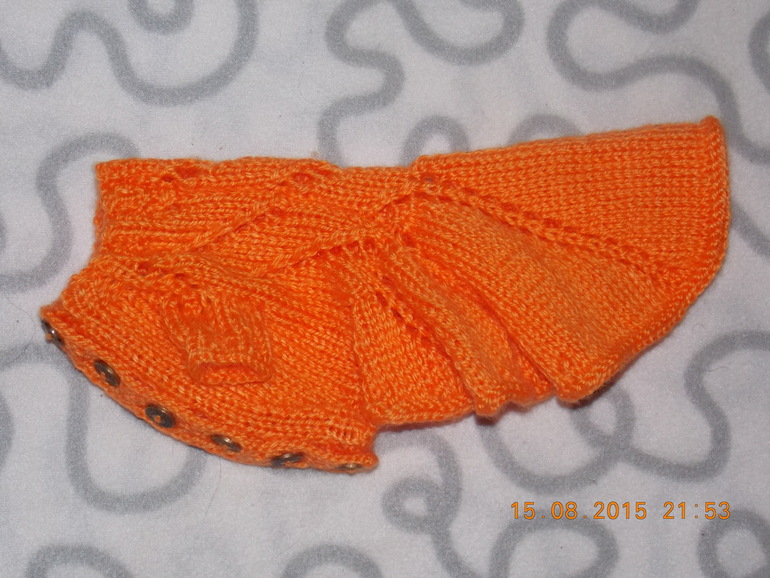 Длинна одежки 26 см, объем в шее 18 см, в груди 27 см))) Пряжа - полушерсть неизвестного мне происхождения, спицы № 3,5 и №4.