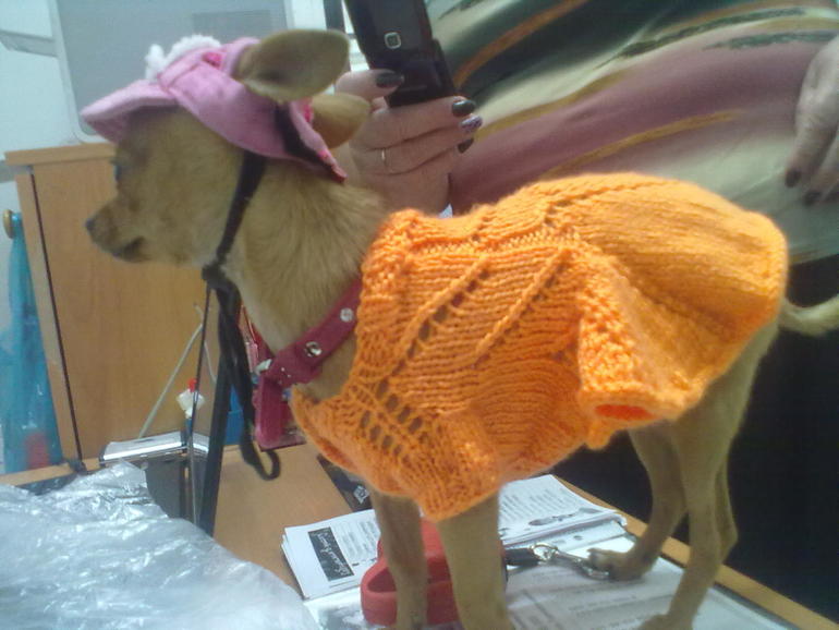 Вязание для животныхЗнакомая знакомой задала задачу - связать наряды для ее маленькой любимицы, той терьера))) Сегодня показываю первую обновку из обещанного гардероба. Я назвала это платьем, а окружающие считают, что похоже на кофту-фрак)))