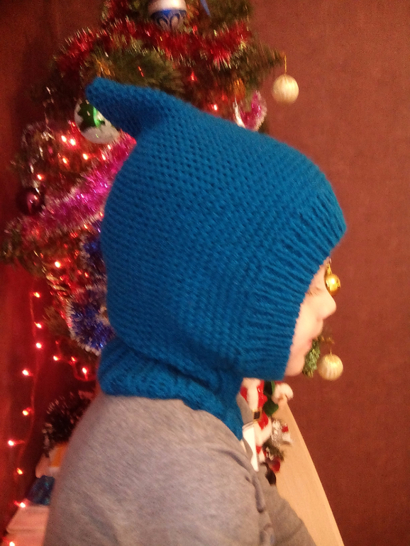 Купила еще осенью в магазине шапку-шлем, а она через неделю носки растянулась и теперь пришла в негодность. Подумав немного и прошерстив схемы в интернете, связала сыну вот такой шлем. Нитки акриловые ( от любой шерсти чешется немилосердно), вязала в две нити. Село плотненько, мне нравится результат.