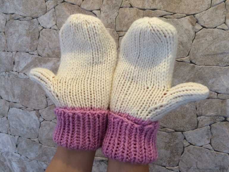 Вязала из объемной пряжи. Варежки получились пухленькие, но на руке сидят хорошо. Тепленькие)))