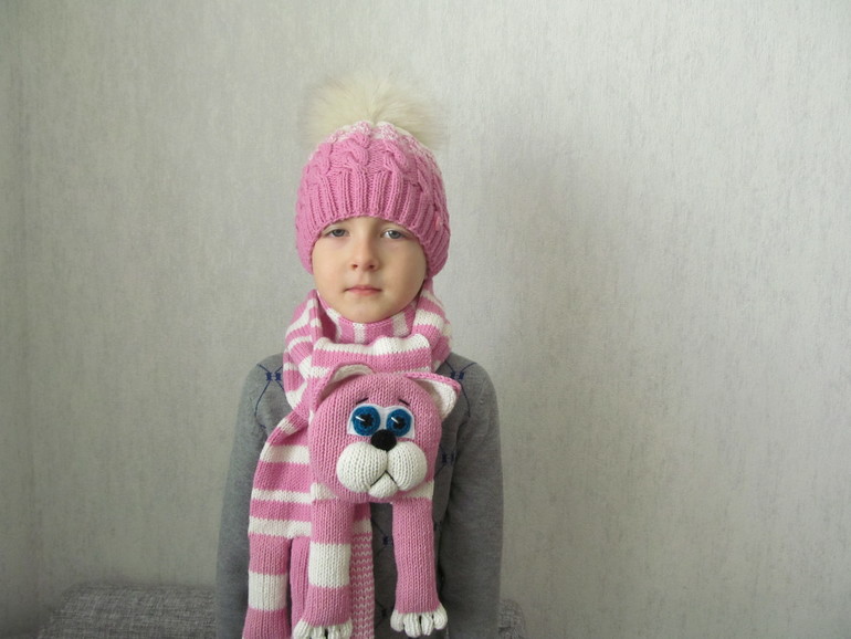 еще фото под катом шапочка размер 50-53см(помпон натуральный), шарфик длиной 130см без учета лап и хвоста. 100% шерсть