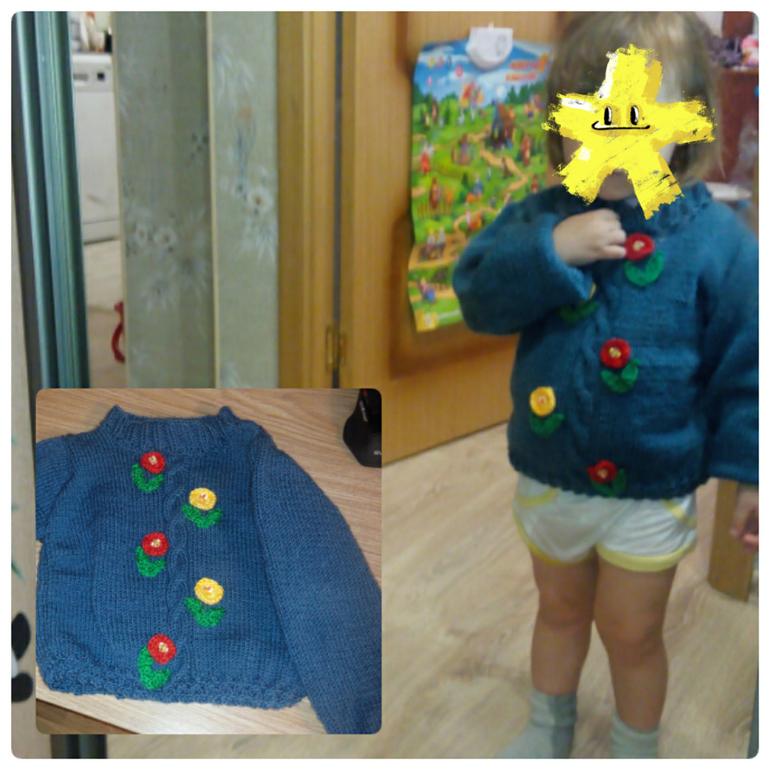 Вязала по схеме с этого сайта: http://prjaga.ru/vyazanie-dlya-detej/pulover-zhaket-sviter/vyazanye-detskie-svitera-s-vyshivkoj. Спицы #3, пряжа nako bambino.