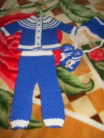 Этот костюмчик из штанишек, кофточки, шапочки и пинеток был связан давно, из него уже выросли. Был связан на три месяца.