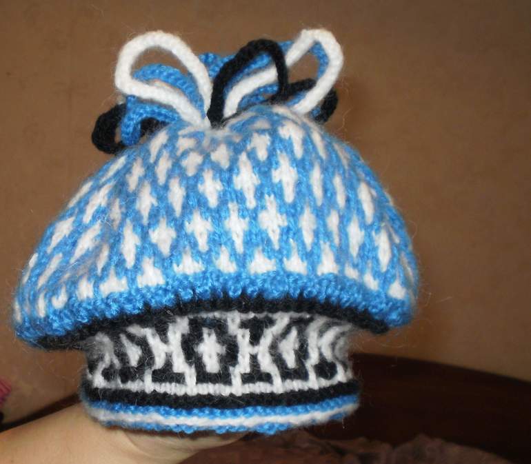 Вроде бы связано спицами , узоры похожи на "Ленивый жаккард". Узоры я могу связать, их можно и поменять,если что не получится. Украшение тоже могу изобразить. А вот как передти от нижней части в верхней - ума не приложу. Может связать отдельно верх, отдельно низ, а потом просто сшить их?