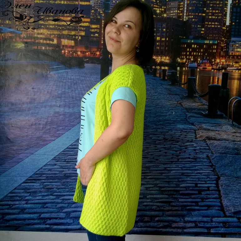 Жакеты, кардиганы для женщинмалиновый кардиган связан из акрил (название не помню), спицы 4,5, шишечки на платочном узоре с кармашками, лимонный связан из вита бриллиант в 2 сложения, спицы 4,5, узор соты из резинки