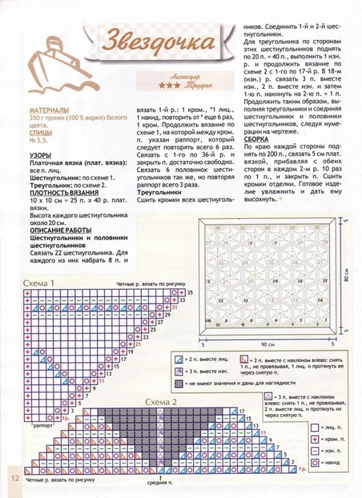 1) Свяжите 22 шестиугольника по схеме 1. Для одного шестиугольника наберите на спицы 8 петель и вяжите: кромочная петля, лицевая, накид (лицевую и накид выполнить еще 6 раз), кромочная. Так необходимо вязать 36 рядов.