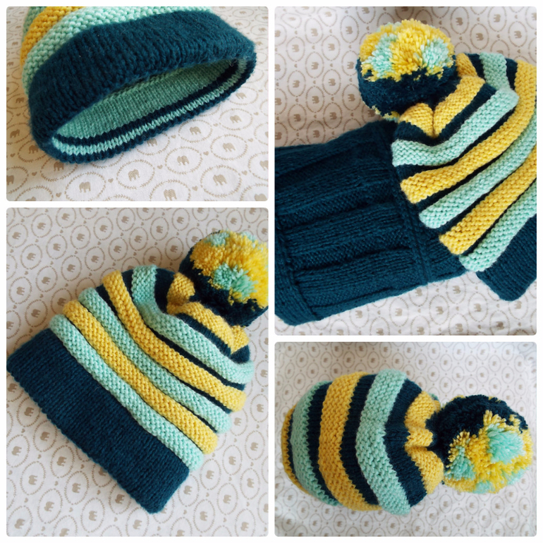 Ребенка особенно впечатлила шапочка - яркая, полосатая, легко одевает сам. Помпон хотела убрать, но сын попросил вернуть обратно))) Получилась шапка унисекс. Меня же радует, что она по размеру (у нас вечная проблема с шапками по соотношению ОГ и глубине шапки) и закрывает уши. На фото видно, что по лобику и ушкам (не знаю как называется эта часть у шапки, отворот наверное) она двойная. Кстати, внутри светло-бирюзовый "отворот", как и цветные полоски, сделан из остатков пряжи Бэби вул ализе - шерсть+акрил+шёлк, так что она очень приятная гладкая и мягкая, где касается кожи. Кофта сзади закрывает шейку, воротник можно поднять. Вообще планировала, что будет носить поверх водолазки. Ну и как всегда из плюсов - она по размеру моему очень стройненькому мальчишке! :)